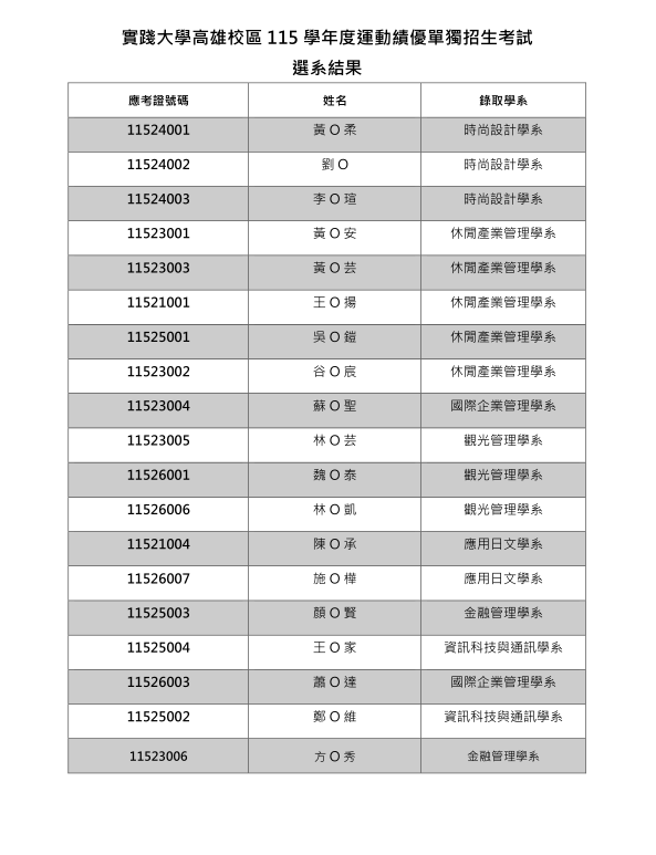 【2026】【運動績優】實踐大學高雄校區運動績優單獨招生選系結果