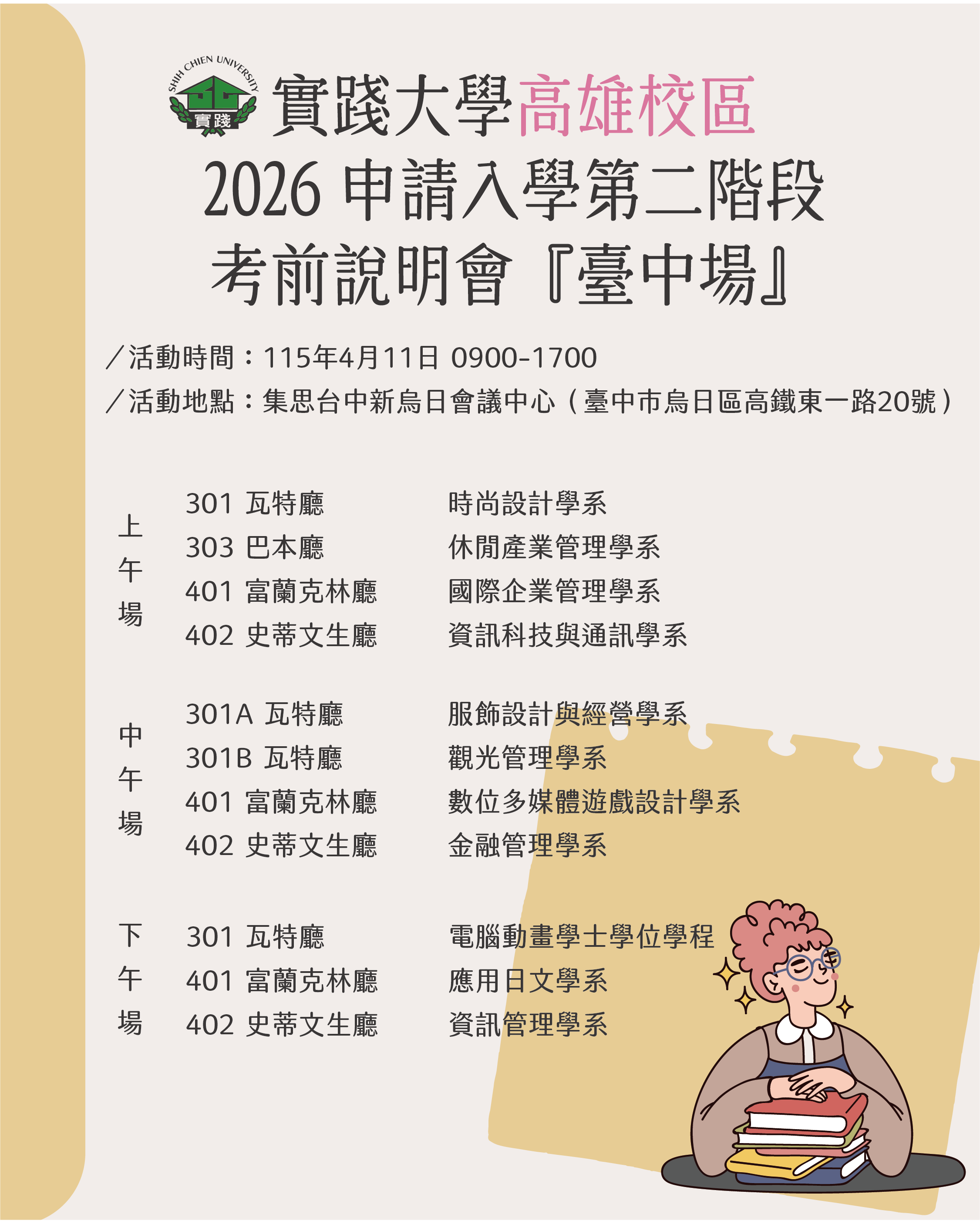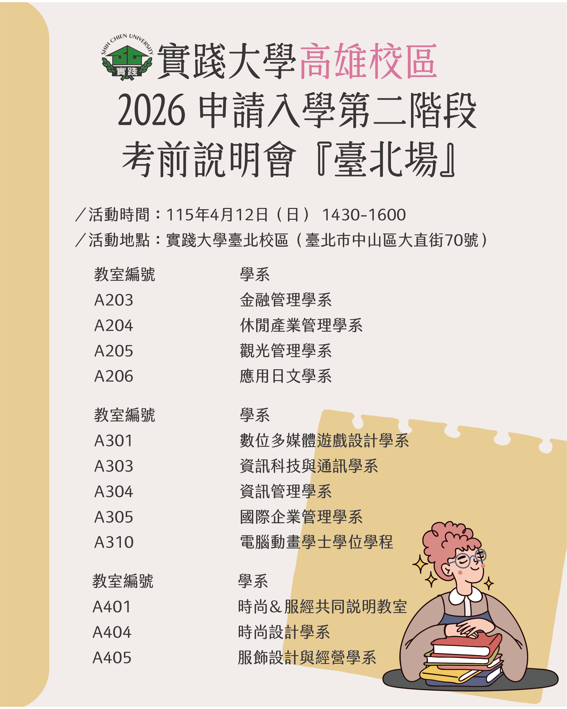 臺北場(4月12日)實踐大學臺北校區(臺北市中山區大直街70號) |
